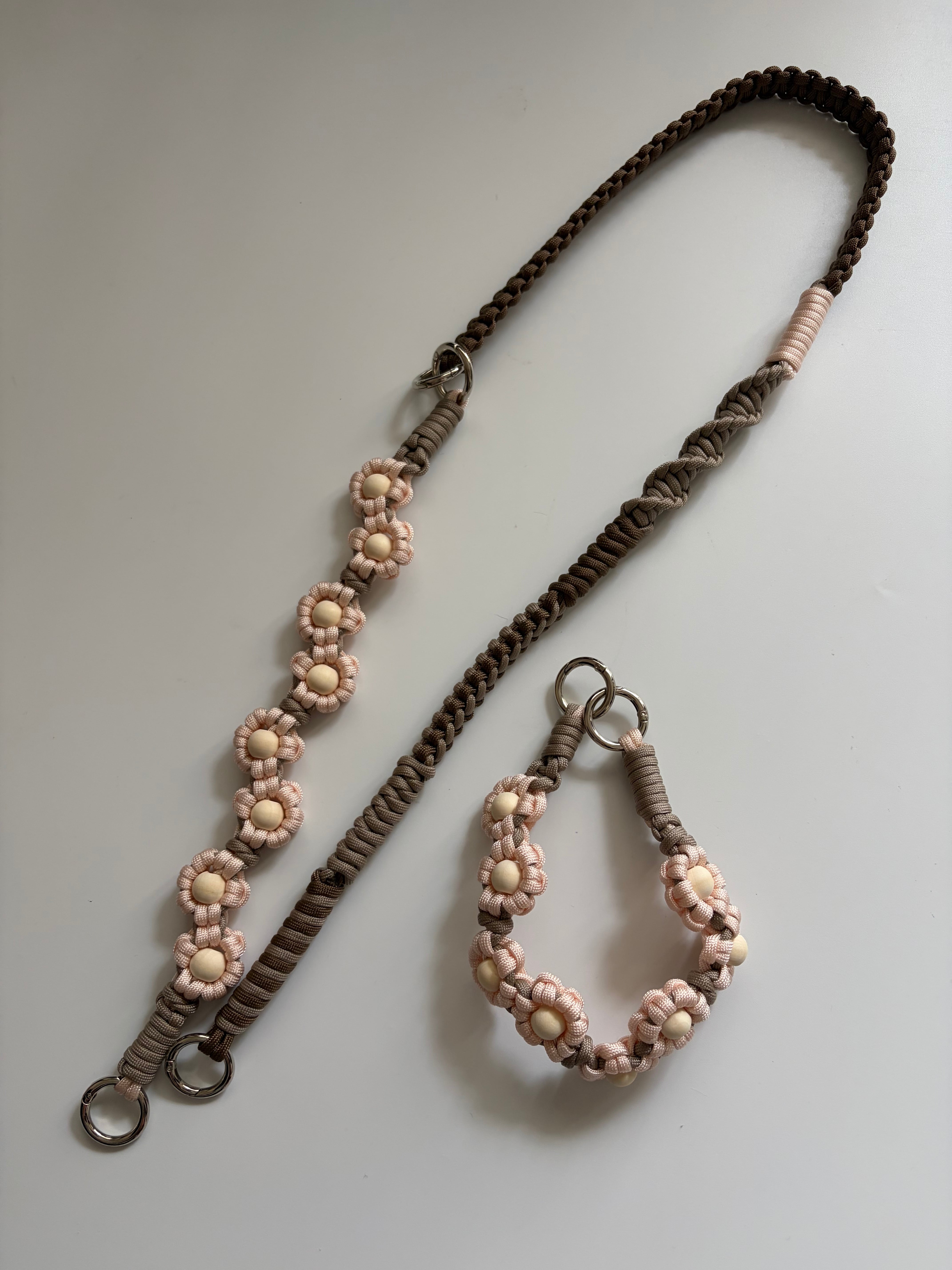 柔らかいピンクのコードを使った、桜をイメージして編んだストラップです。