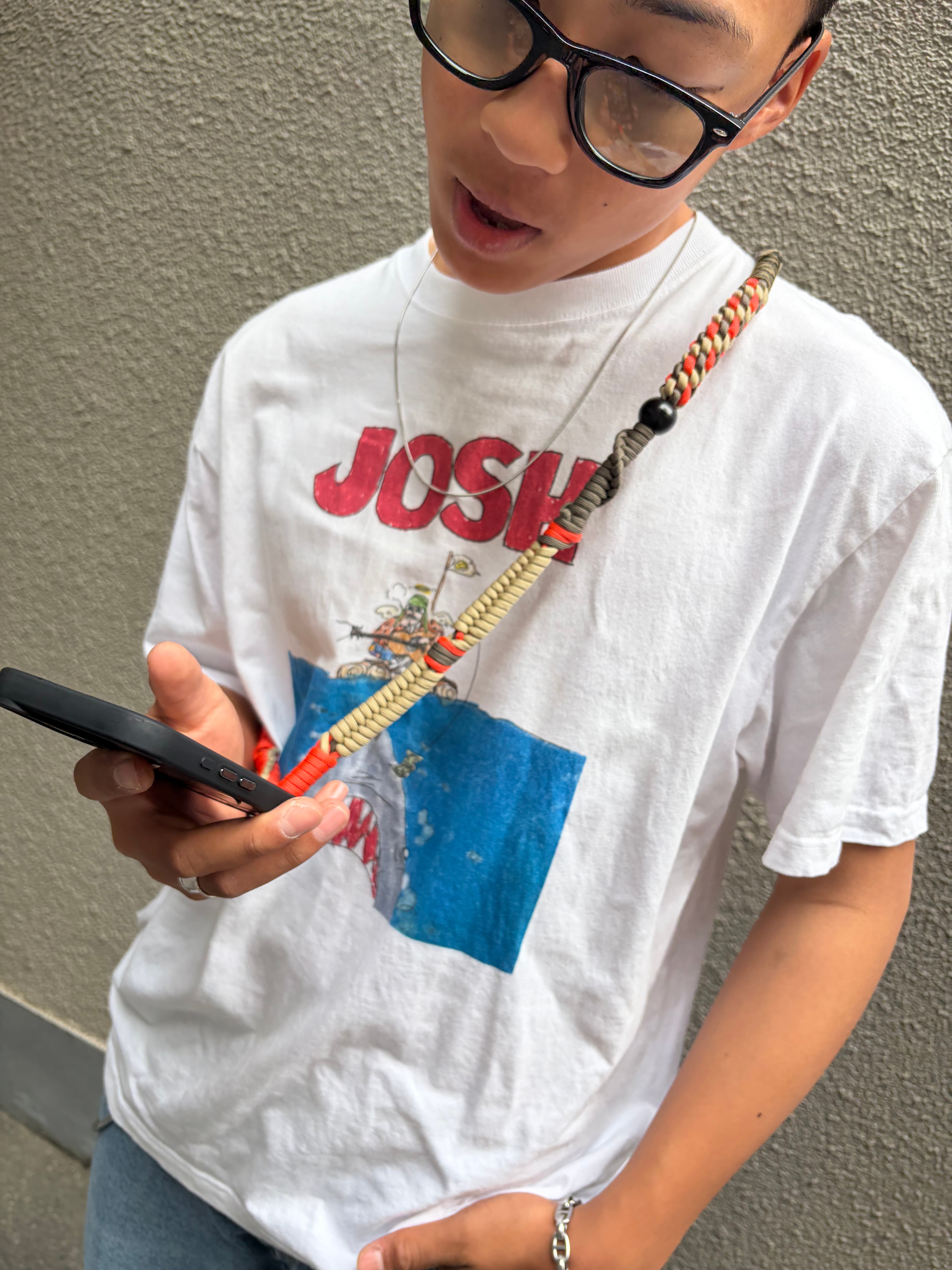 シンプルなコーディネートにストラップで色を足してオシャレに。